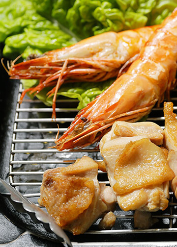 - 三ヶ日牛ロース(300g)、牛ロース(100g)、豚バラ(100g)、味付けホルモン(こてっちゃん風)、骨付きソーセージ 3本、海鮮セット(海老・烏賊・帆立) 2人前